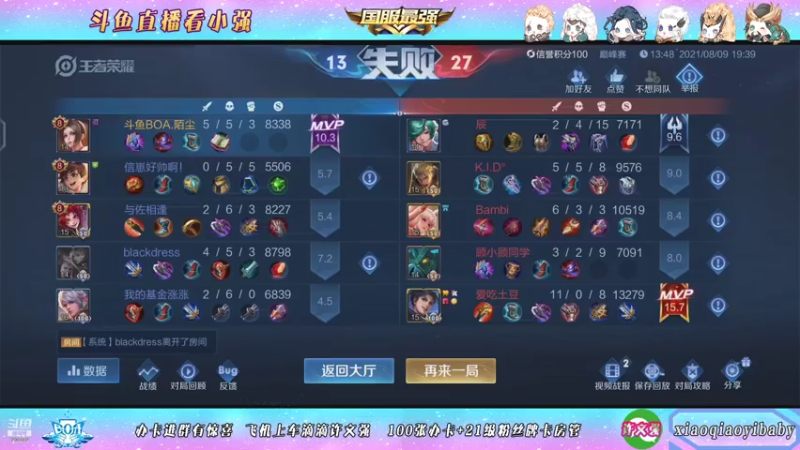 【2021-08-09 15点场】BOA小强:全能国服,带飞全场