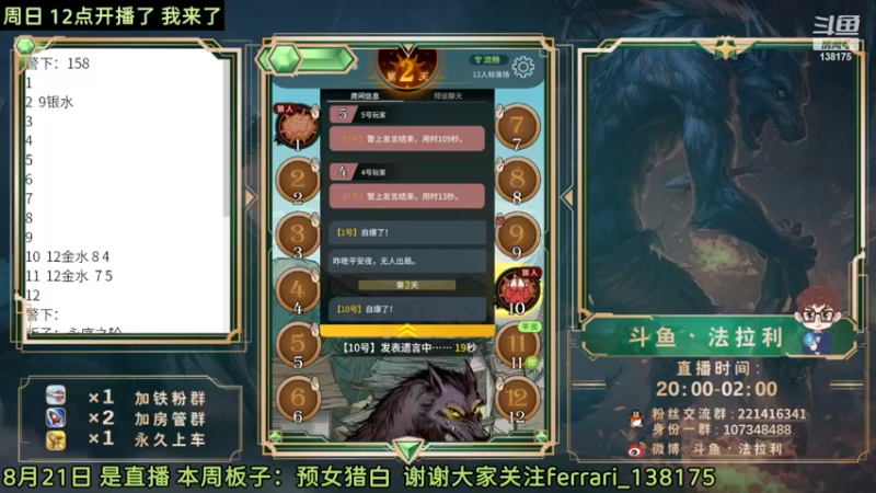 【2022-08-21 20点场】法拉利的直播间:斗鱼NO.1 怒C 把把点4狼