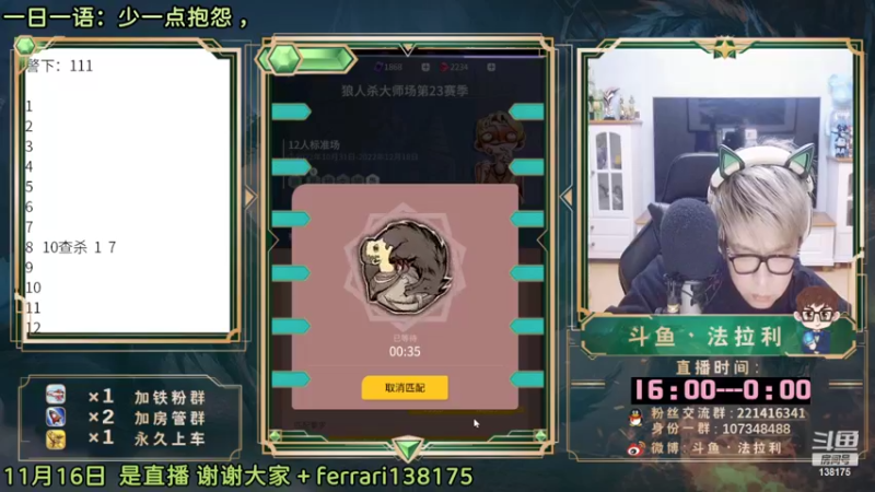 【2022-11-16 22点场】法拉利的直播间:大师赛重启开始怒冲榜一