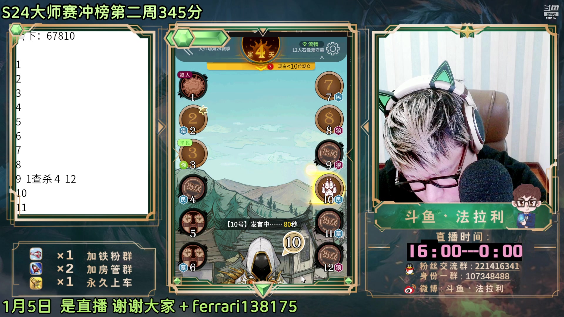 【2023-01-05 16点场】法拉利的直播间:斗鱼NO.1最强狼人杀心理学技术主播