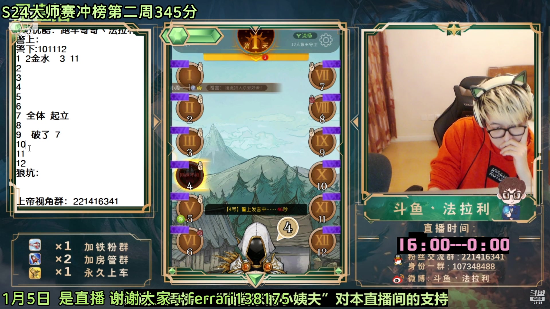 【2023-01-05 12点场】法拉利的直播间:斗鱼NO.1最强狼人杀心理学技术主播