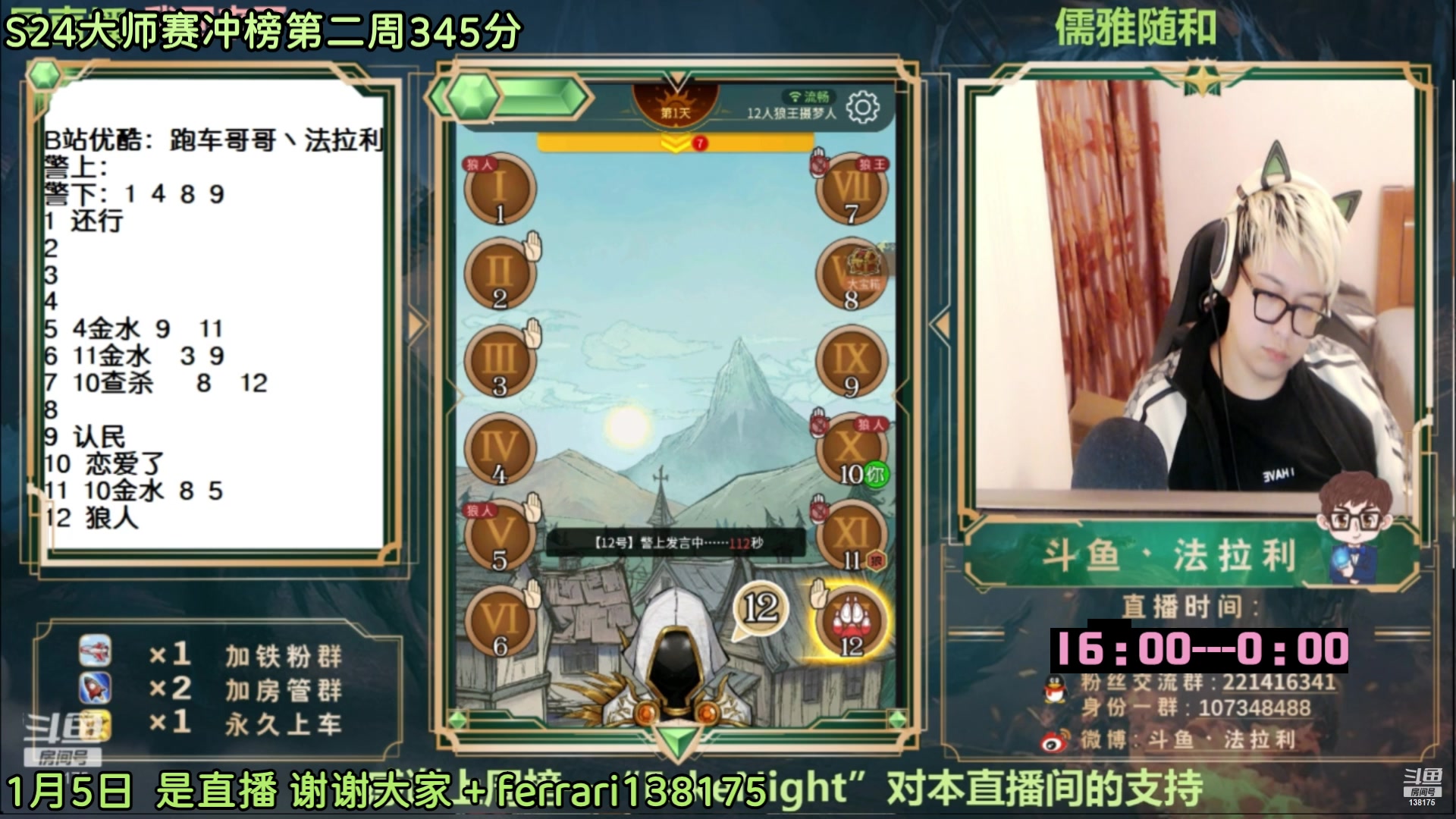 【2023-01-07 12点场】法拉利的直播间:斗鱼NO.1最强狼人杀心理学技术主播