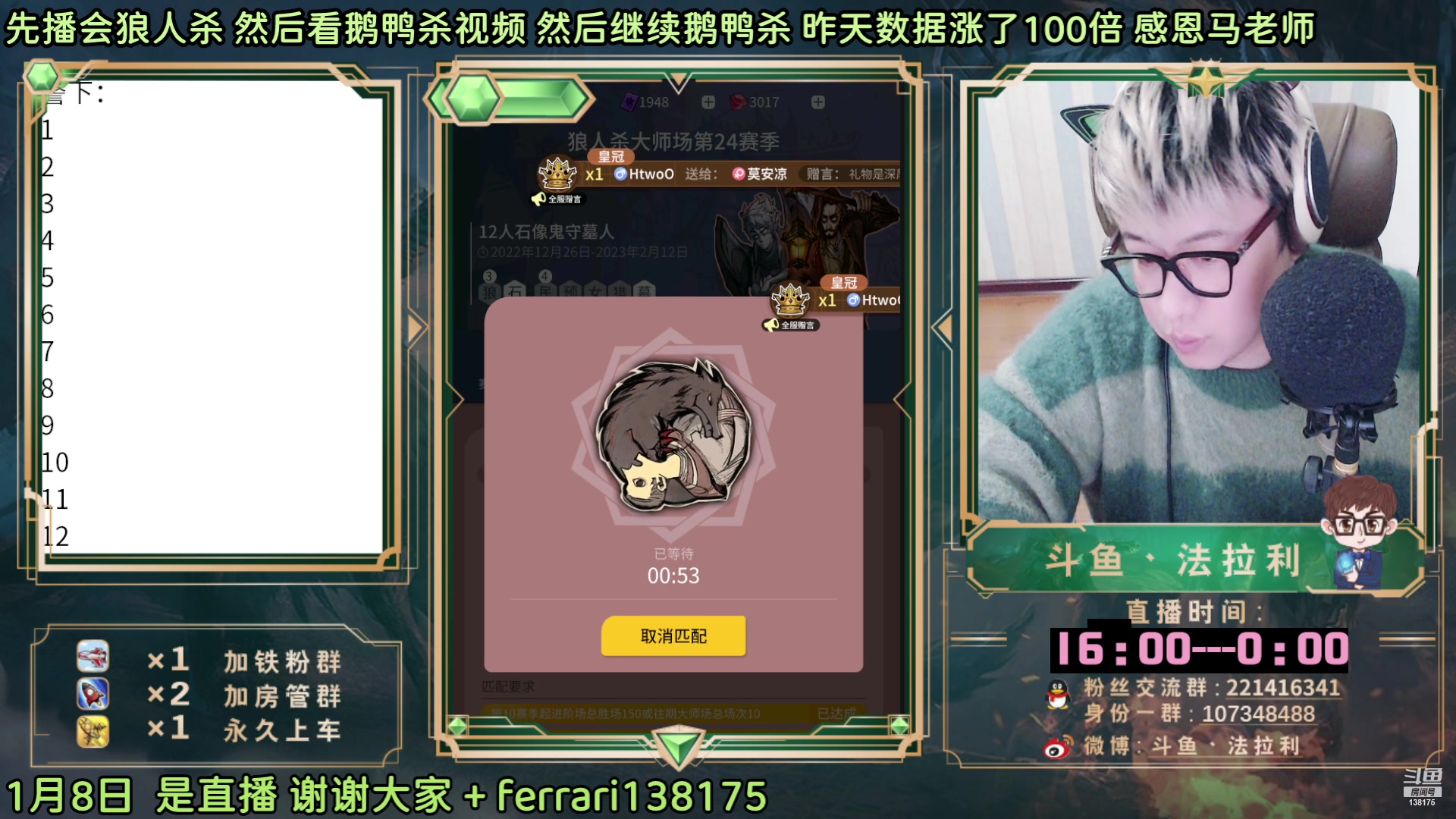 【2023-01-08 21点场】法拉利的直播间:斗鱼NO.1最强狼人杀心理学技术主播