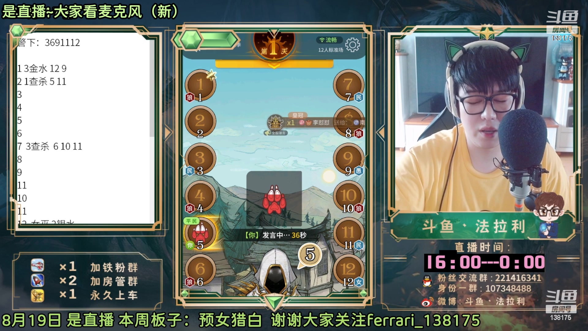 【2023-01-19 16点场】法拉利的直播间:斗鱼NO.1最强狼人杀主播