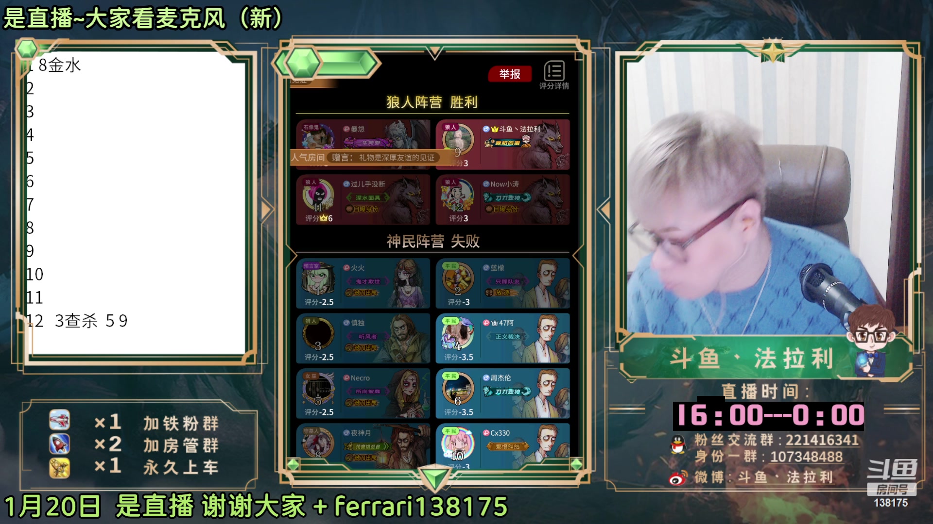 【2023-01-20 16点场】法拉利的直播间:斗鱼NO.1最强狼人杀主播