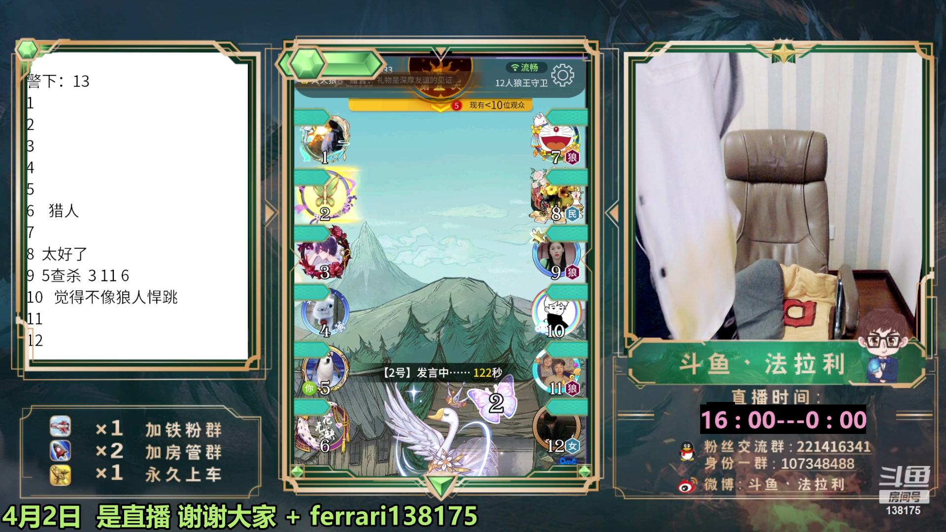 【2023-04-02 12点场】法拉利的直播间:国服第一狼人杀教学1小时学会点四狼