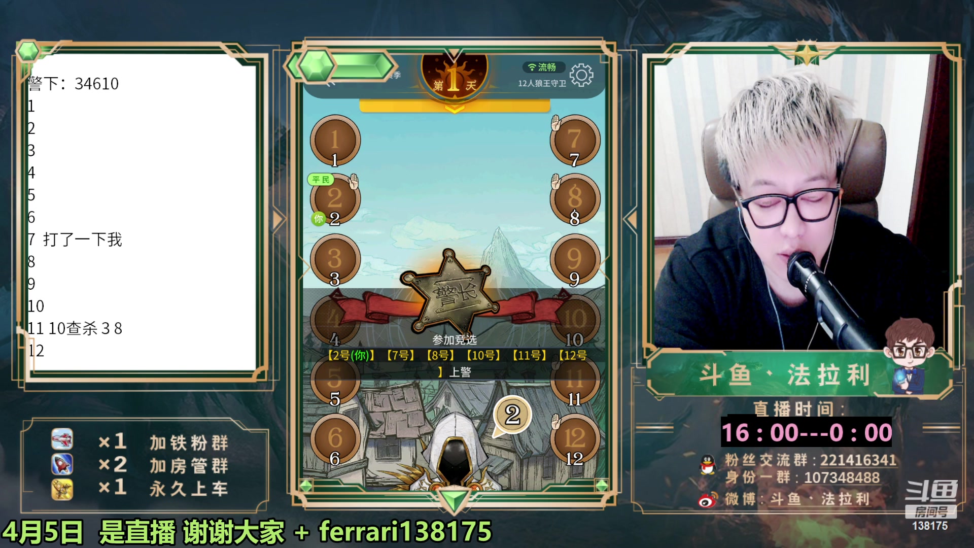 【2023-04-05 23点场】法拉利的直播间:国服第一狼人杀教学1小时学会点四狼