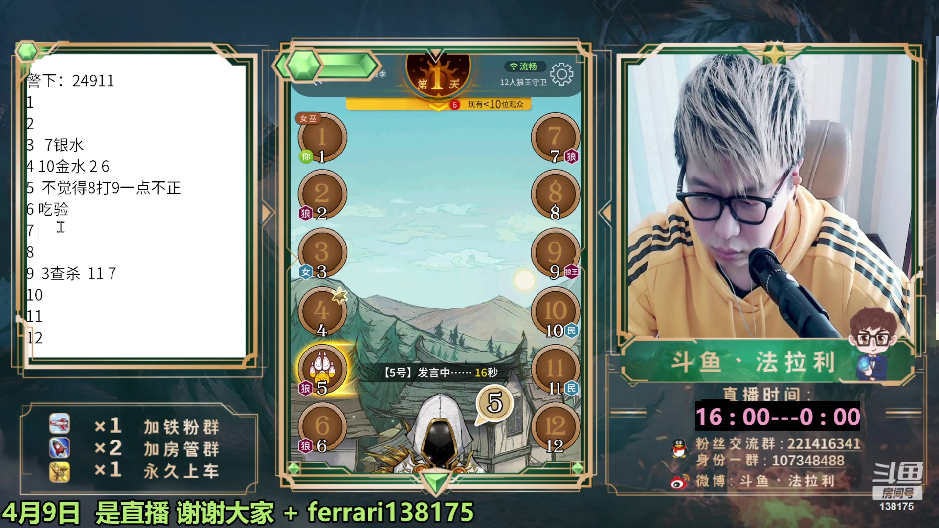 【2023-04-09 12点场】法拉利的直播间:国服第一狼人杀教学1小时学会点四狼