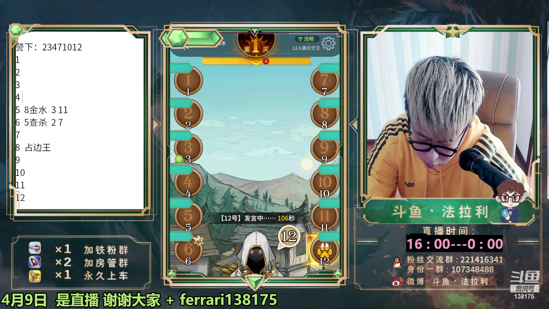 【2023-04-09 12点场】法拉利的直播间:国服第一狼人杀教学1小时学会点四狼