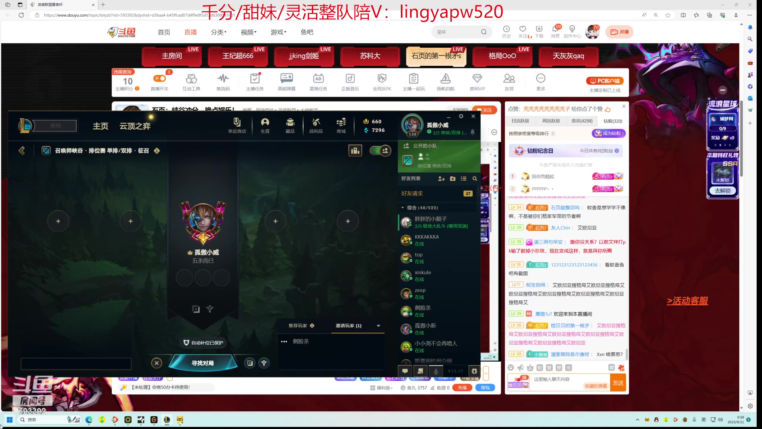 【2023-09-10 19点场】石页的第一根矛s:石页:峡谷冲分,晚点娱乐!