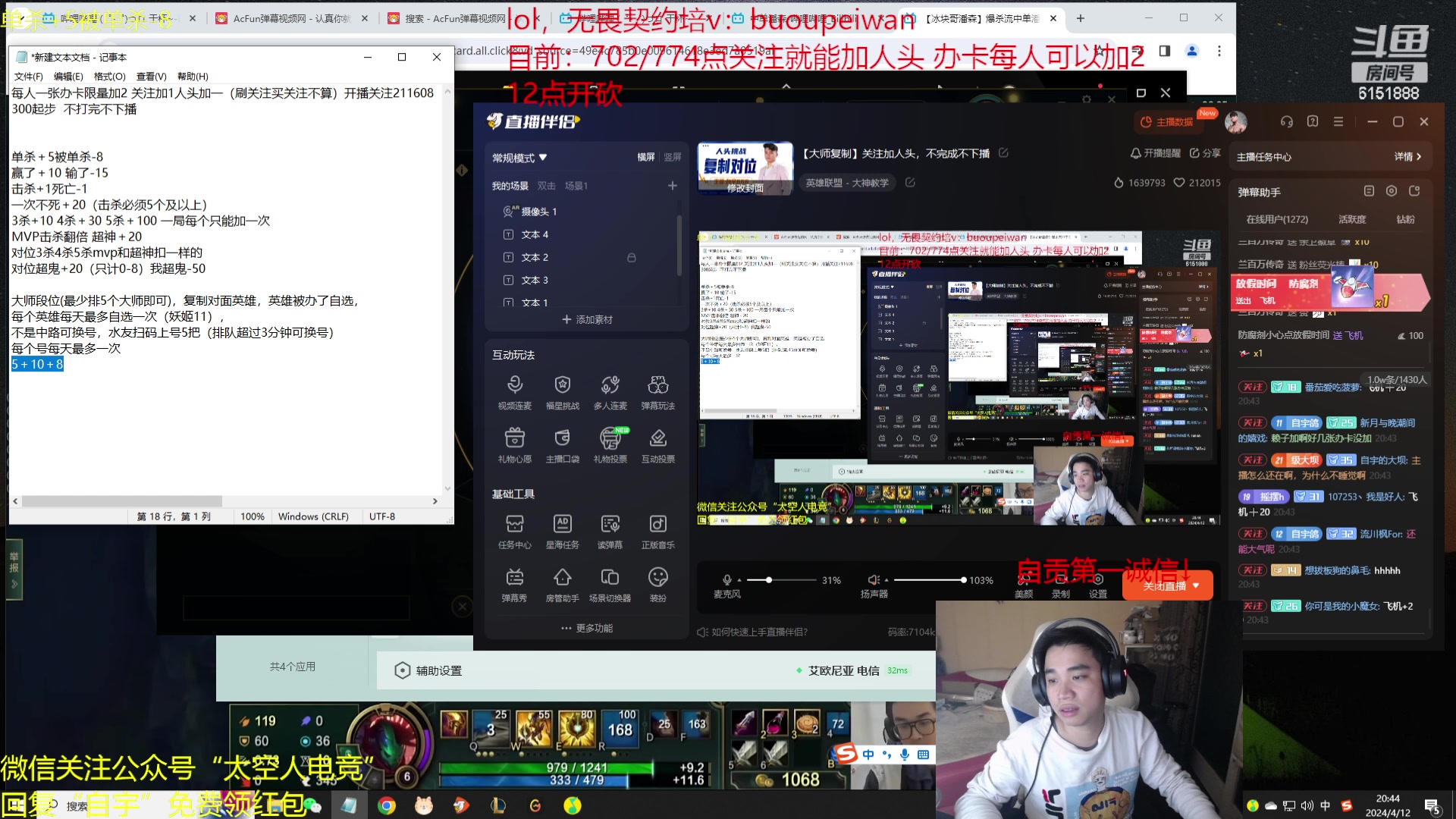 【2024-04-11 12点场】自宇666:【大师局】关注加人头,不完成不下播