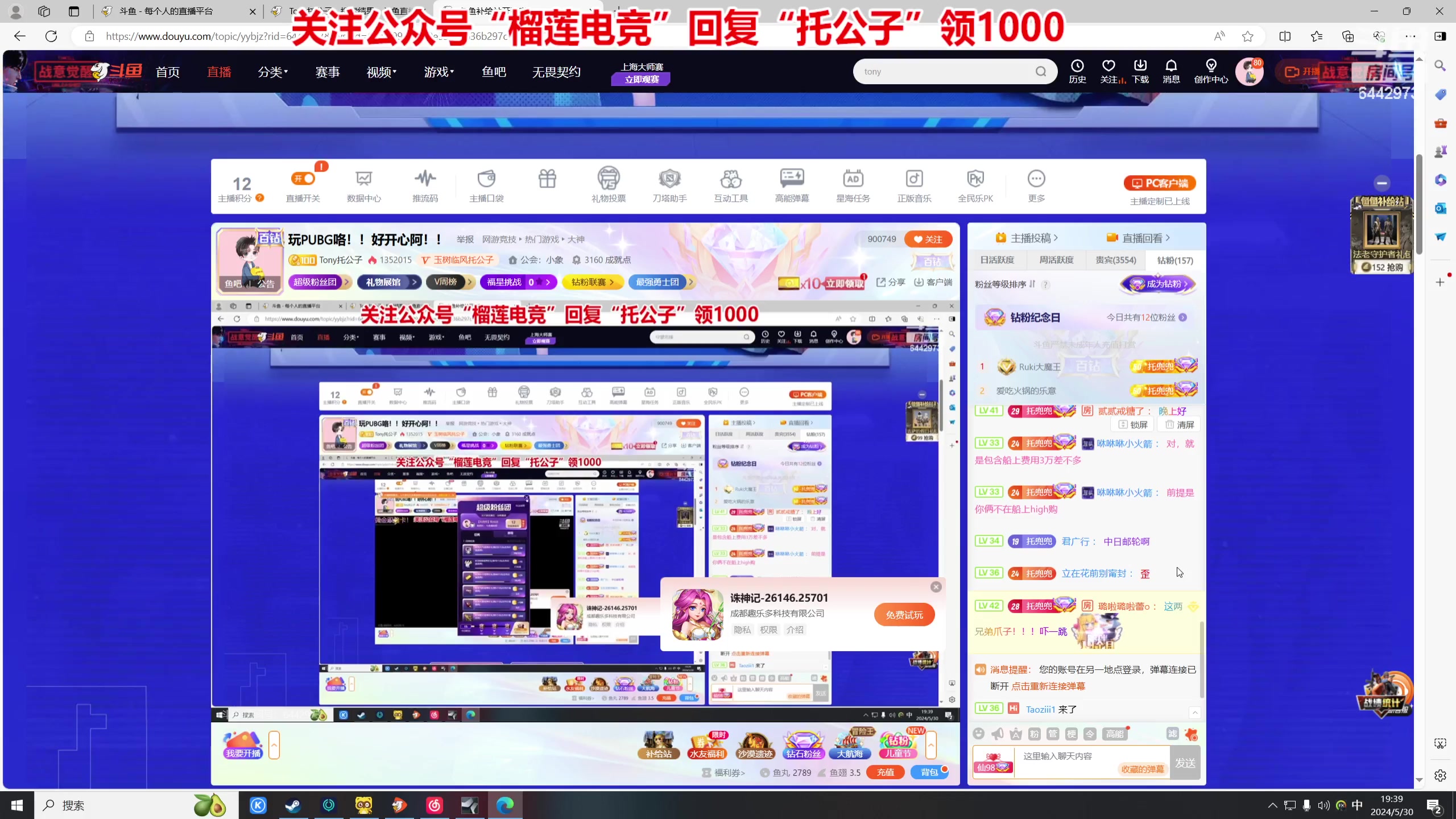 【2024-05-30 17点场】Tony托公子:玩PUBG咯!!好开心阿!!
