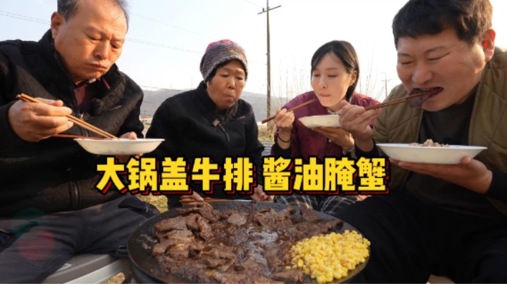 兴森一家新年派对,焦香秋成勋牛排 + 入味酱油腌蟹。