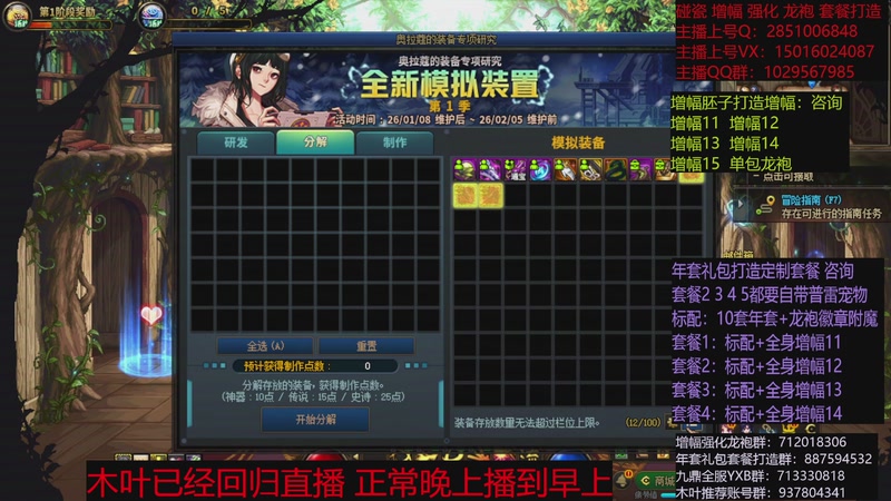 【2026-01-26 16点场】DNF木叶剑心:助理:2026年年套增幅强化木叶晚上播