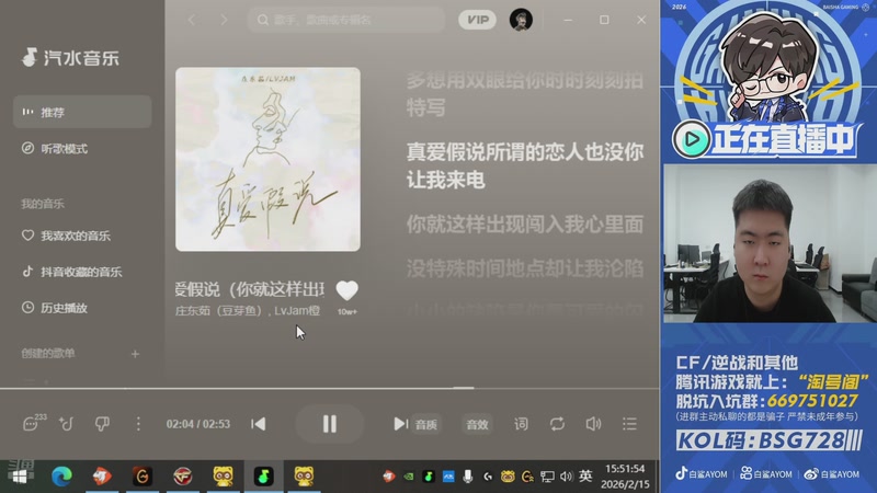 【2026-02-15 11点场】白鲨AyoM:下午微笑播-晚上念旧播-梦里老白播