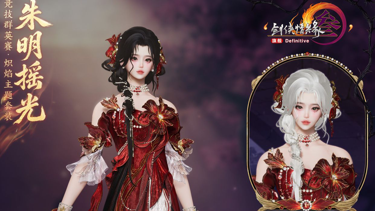 ---炽焰主题套装“朱明摇光”--- 飞焰流丹逐晓色,会逢知己仗剑行!全新竞技群英赛·炽焰主题套装“朱明摇光”以赤锦着身,凝熔金之质。鸢尾盛绽如烈火焚灼,暗红色泽潜藏千钧战意,将沉着从容内敛于心,临风不折,历火弥坚。