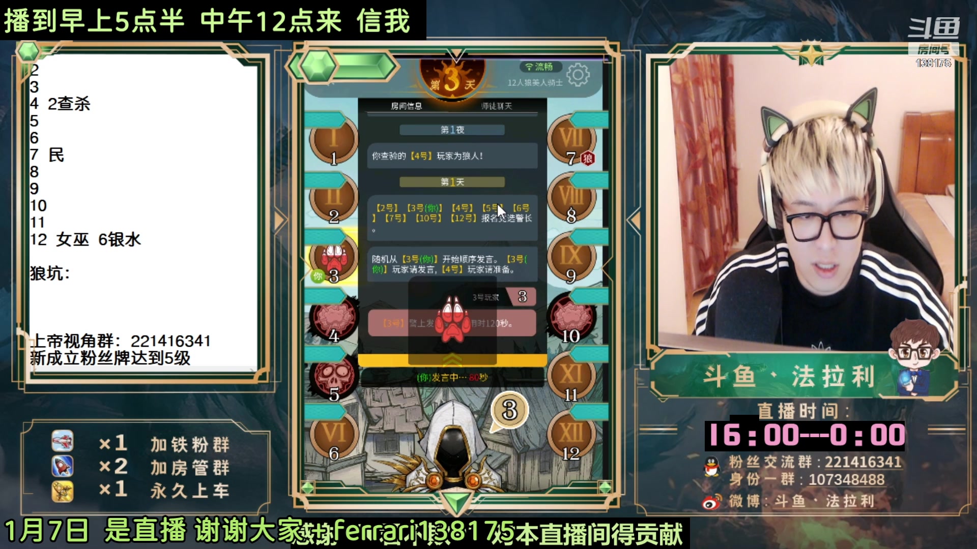 【2023-01-08 07点场】法拉利的直播间:斗鱼NO.1最强狼人杀心理学技术主播