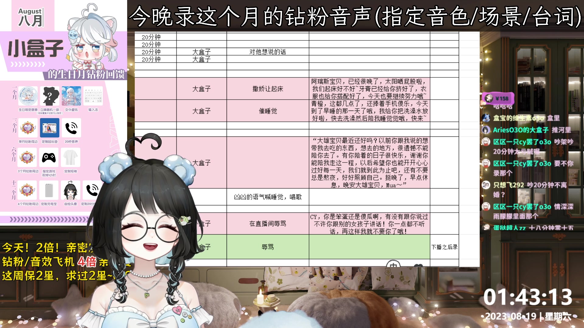 【2023-08-19 01点场】小盒子o3o:她不在,可以来看我吗?︿( ̄︶ ̄)︿
